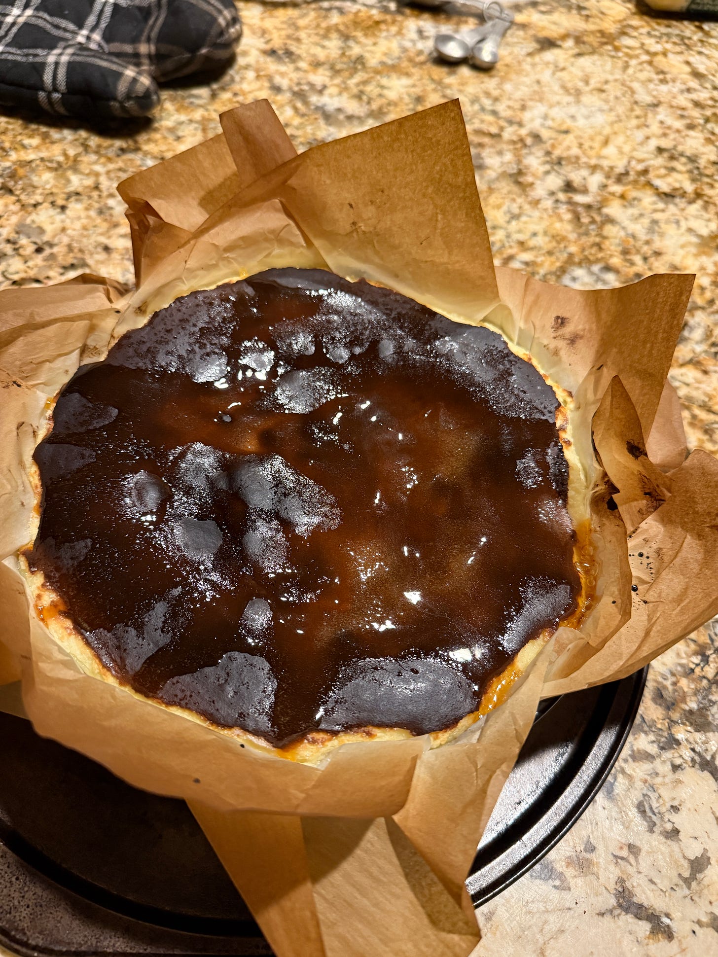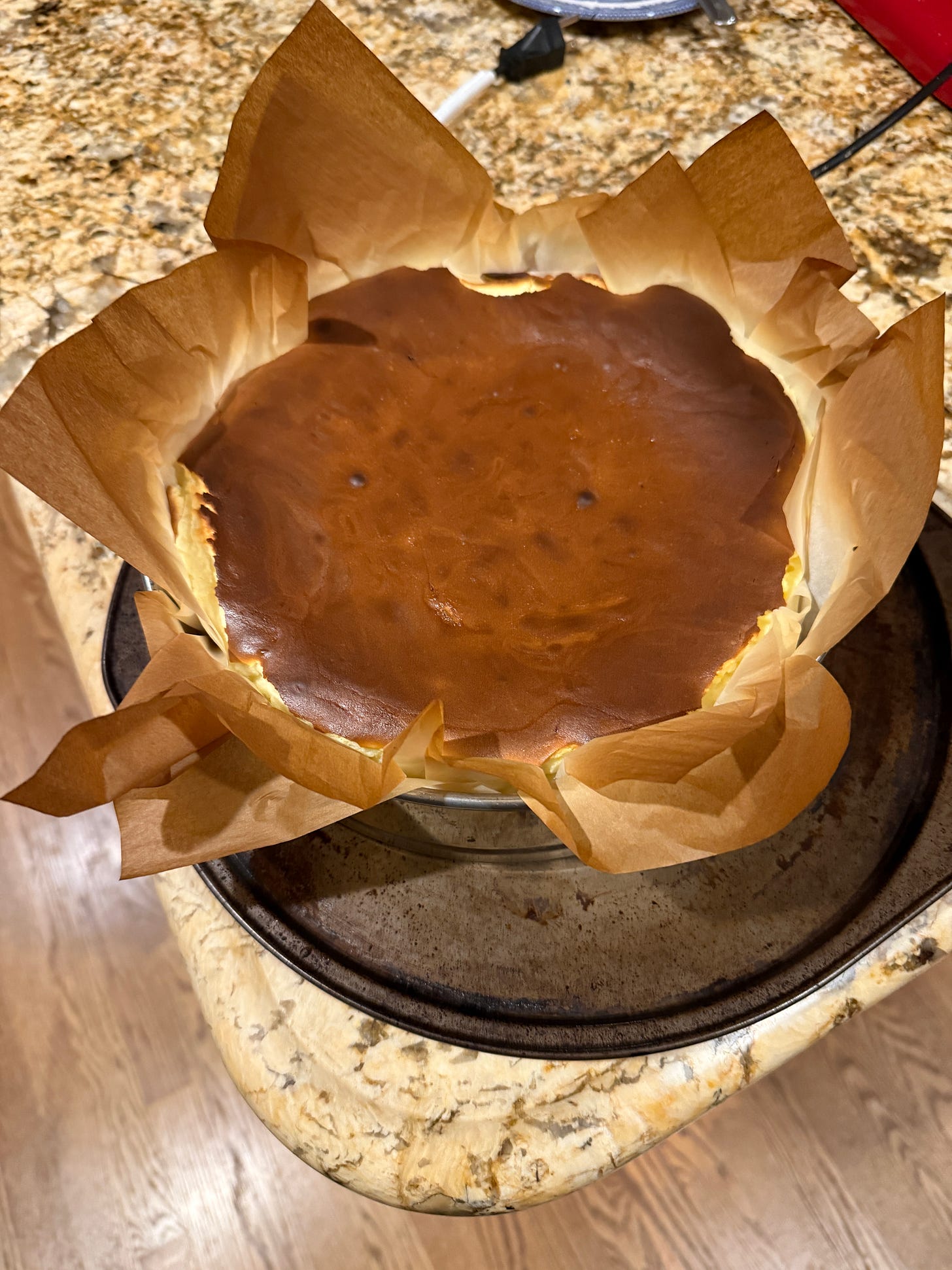 And the top should be nicely caramelized. If it isn't or the jiggle is too loose, let it be in there for another 2-3 minutes and try again. 14. When ready, take it out and let cool completely. You don't have to cool this like a regular cheesecake. The caramelized top holds it from splitting apart. The cake will sink in on itself. (see pictures below). 15. Refrigerate once cooled, but yank it out of the fridge for a mite before serving. You want it closer to room temperature than fridge temperature. It tastes and feels better.