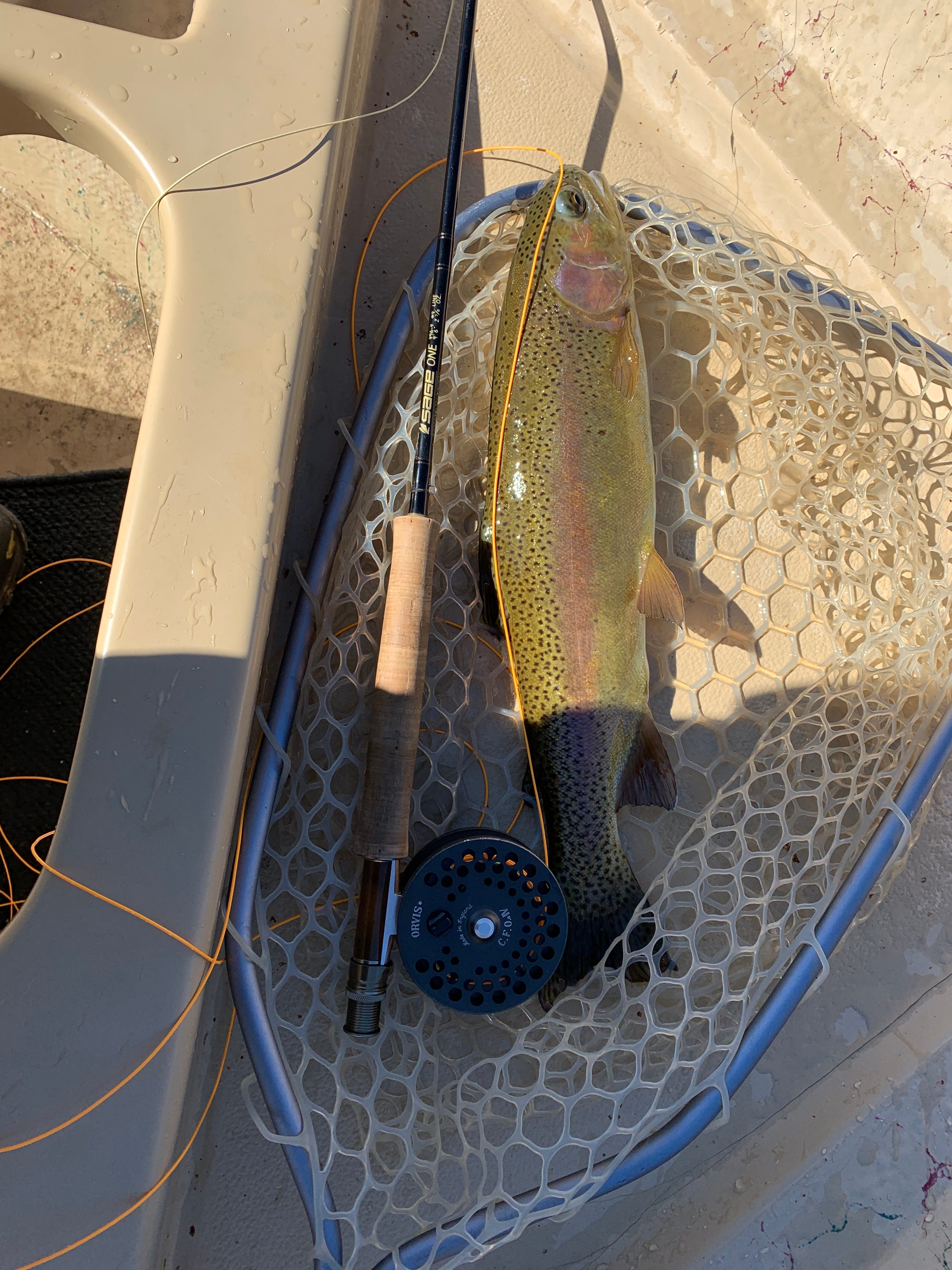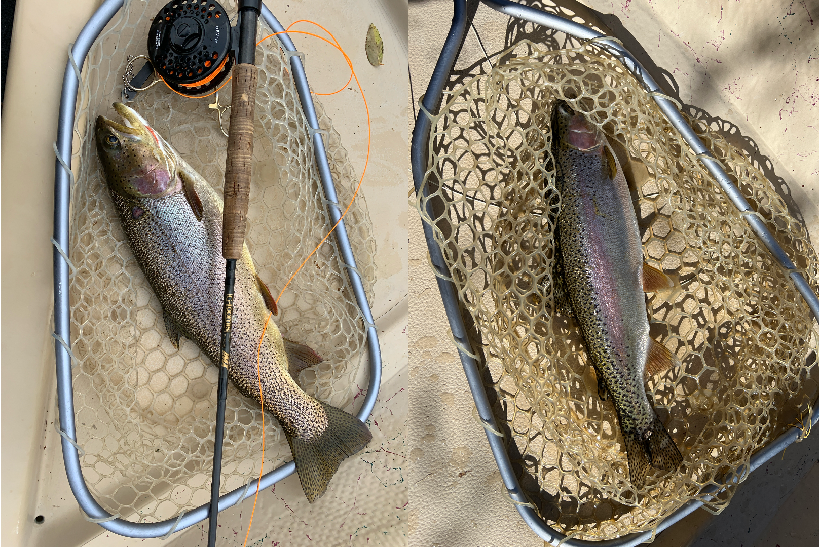 So whether it’s a brawling high water river or a late season gentler version of itsef, it’s just better fished from a boat, if you can get to one. You drift down the river casting ahead of yourself, gently laying your flies down in the margin and surgically dissecting it to find the fish. This chunky cutthroat and sleek rainbow both came from the margins of the Colorado downstream of Glenwood Springs on fine late October day marked by spitting snow and a westerly breeze.