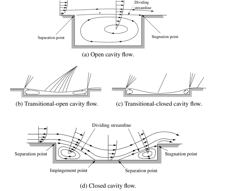 I am by training an aerospace engineer, a fluid dynamicist. In the world of fluid dynamics we have a phenomenon called cavity flow. On broad terms cavity flow, to the fisherman is just a back eddy. But in actuality cavity flows are myriad and 3-dimensional. The diagrams below show a number of different cavity flow conditions.