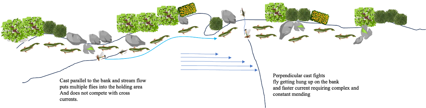 I like fishing from a boat. And I’ll tell you why. But that’s not always possible, so see if you can implement these strategies wade fishing. First, don’t cast perpendicular to the bank. This spells disaster in many ways. Before all is said and done, I’m going to convince you to fish with more than on fly on your leader. If you agree, you’ll find that casting perpendicular to the bank will inevitably point the point flies onto the ground, if the top fly goes where it’s supposed to go.