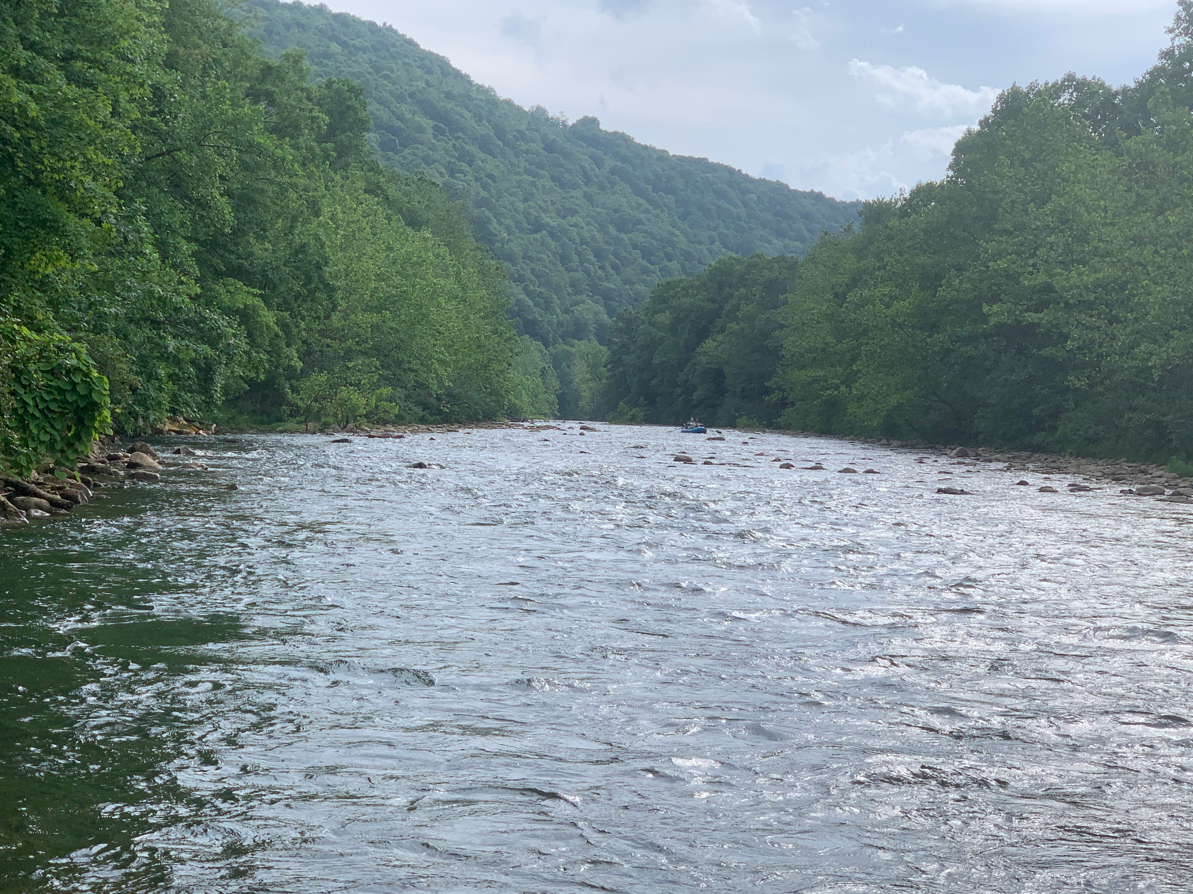 It isn’t always high water that causes fish to hold in the margins. The characteristics of some rivers, or areas of rivers force trout into the margins at any time of the year. Here’s an Eastern river in July at nominal water flows. But the conditions in this area are such that there’s a fast moving center section and a nice soft margin along the banks, particularly river right.