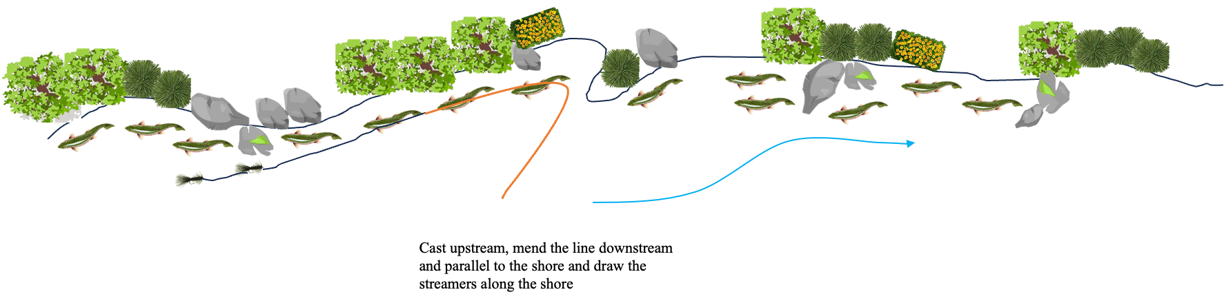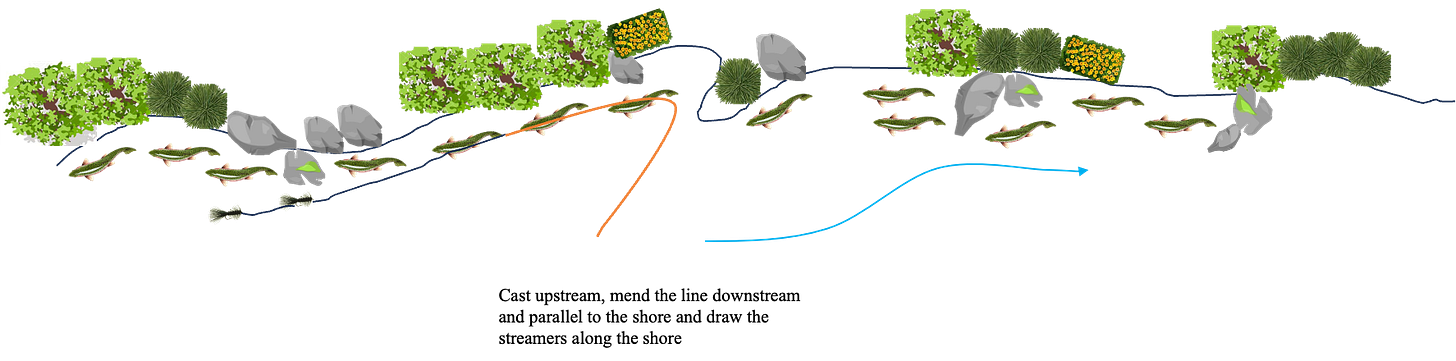 The other exception is fishing streamers. I do fish multiple streamers, on the rare occasion that I do fish streamers (I just can’t get past the fact that fishing streamers is work). But when fishing the margin I like to cast them upstream of where I am, mend the line up parallel to the bank and then draw the flies downstream.