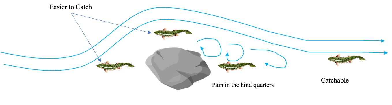 A cast made parallel to the streamflow allows one to drop the flies into the right spot, without potentially getting one hung up on shore. It also positions the flies for a longer float in the holding zone, as opposed to the faster current pulling the fly away from the holding area. With one exception I like to fish downstream, when plying the margins. Trout will typically hold in front or to the side of boulders or behind them. Unless they are some distance behind the boulder they’re really tough to catch. I always refuse to apply some anthropomorphic explanation to trout behavior, so this is merely an observation. The ones in front and to the side are much easier to catch.