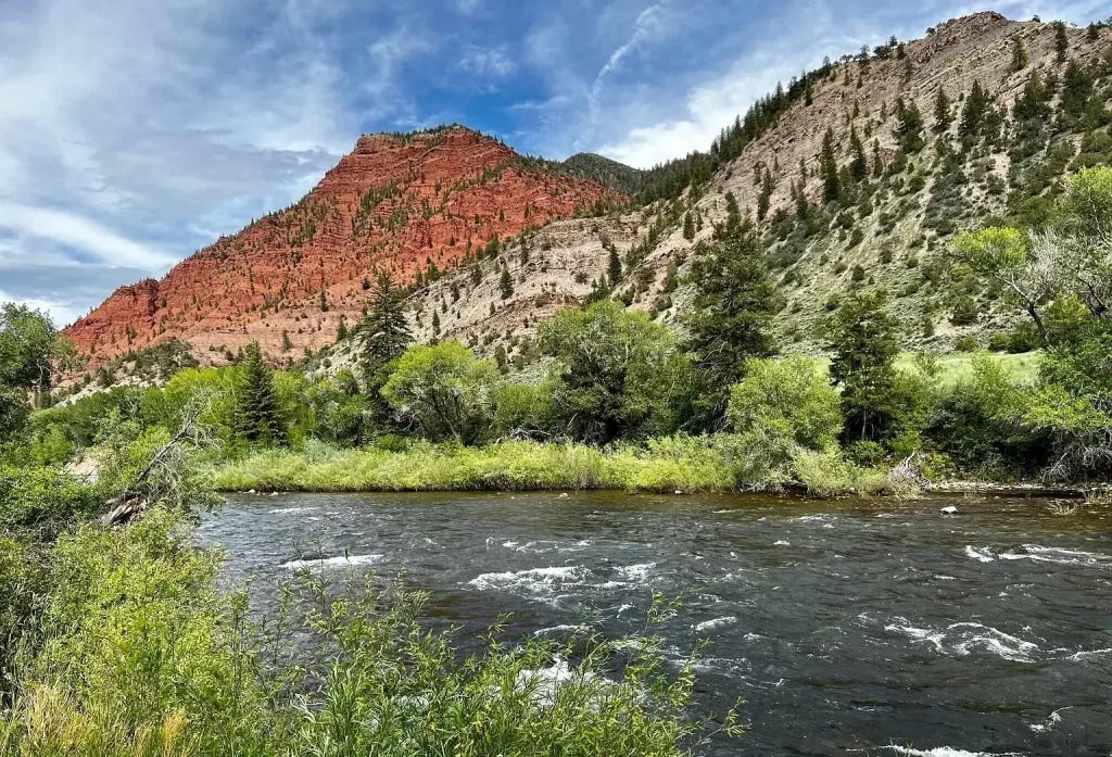 Drift down this section of the best trout river in my world. Cast an ant and a beetle under and around that overhanging vegetation.
