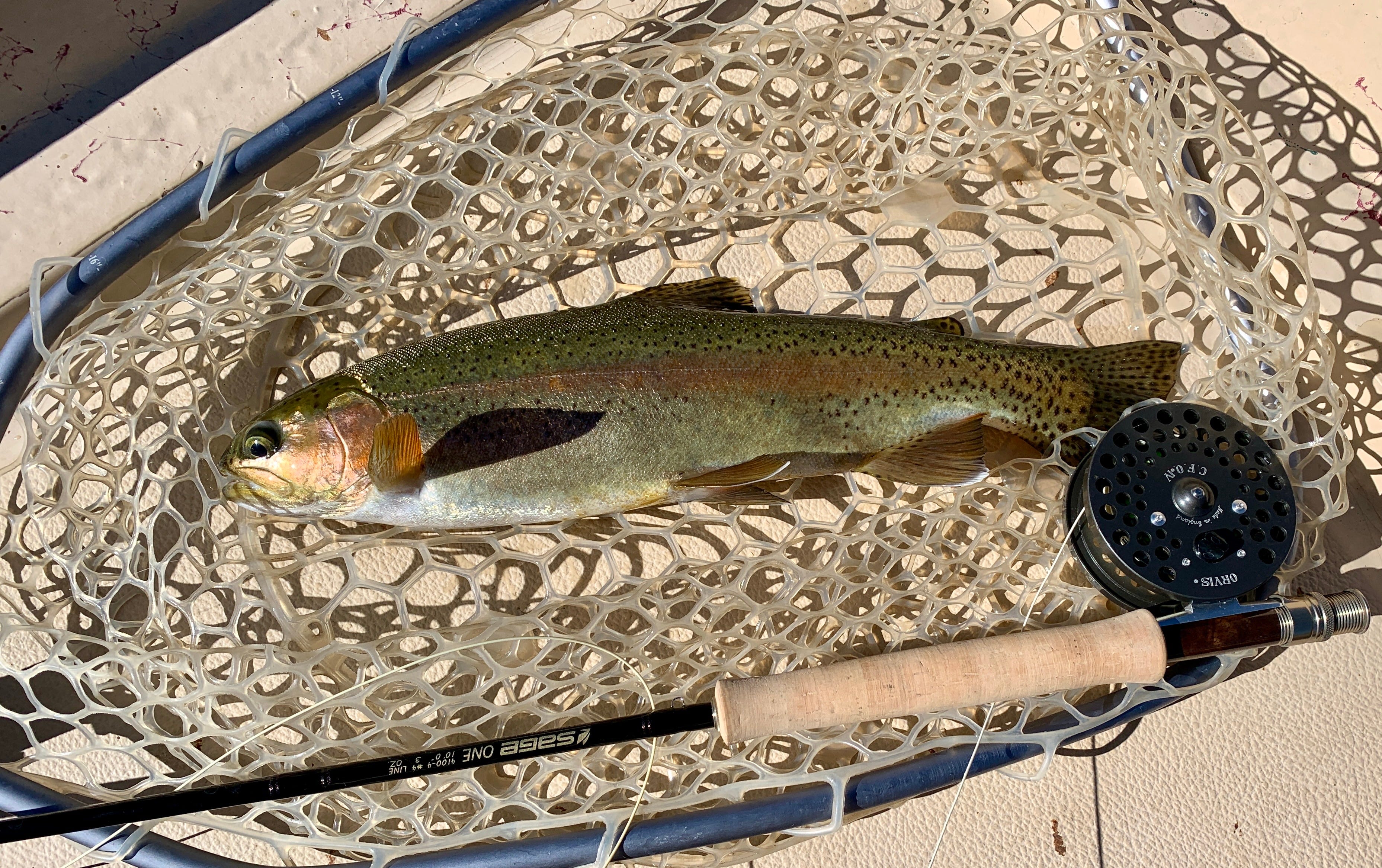 The water was rushing down the river in a mostly unfishable torrent, however, there were soft cushions along the edges where the fish could hold and feed. But you had to get their attention fast because the raft we were in went drifting by in a hurry. A sort of fly fishing drive by.