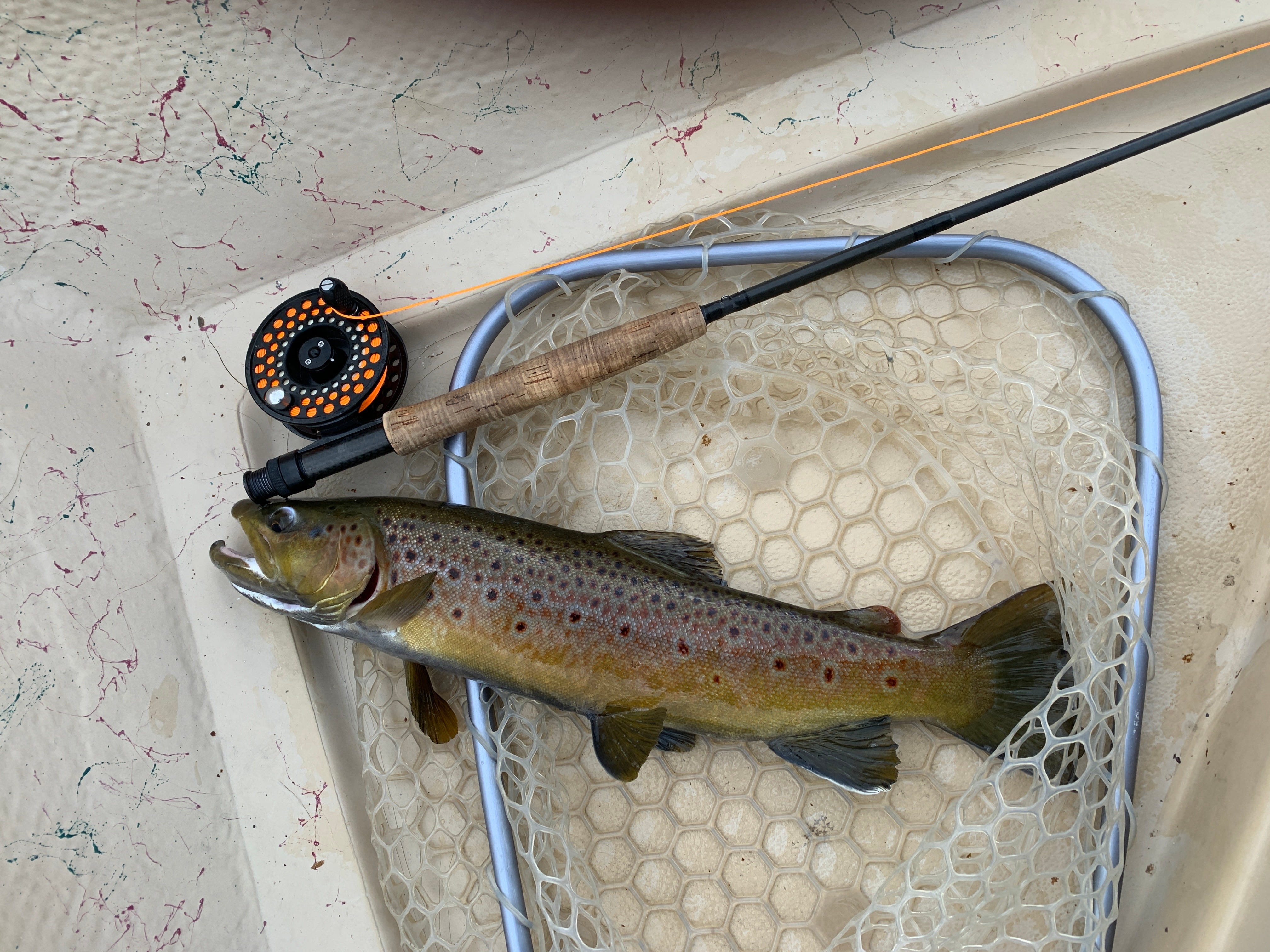 The flows are lower and gentler. This is the time of the fall Blue Winged Olive and midge hatches. The flies often come off at the same time. The trout line up along the seams and suds lines, in the back eddies and feed voraciously. Hook jawed post spawn brown,