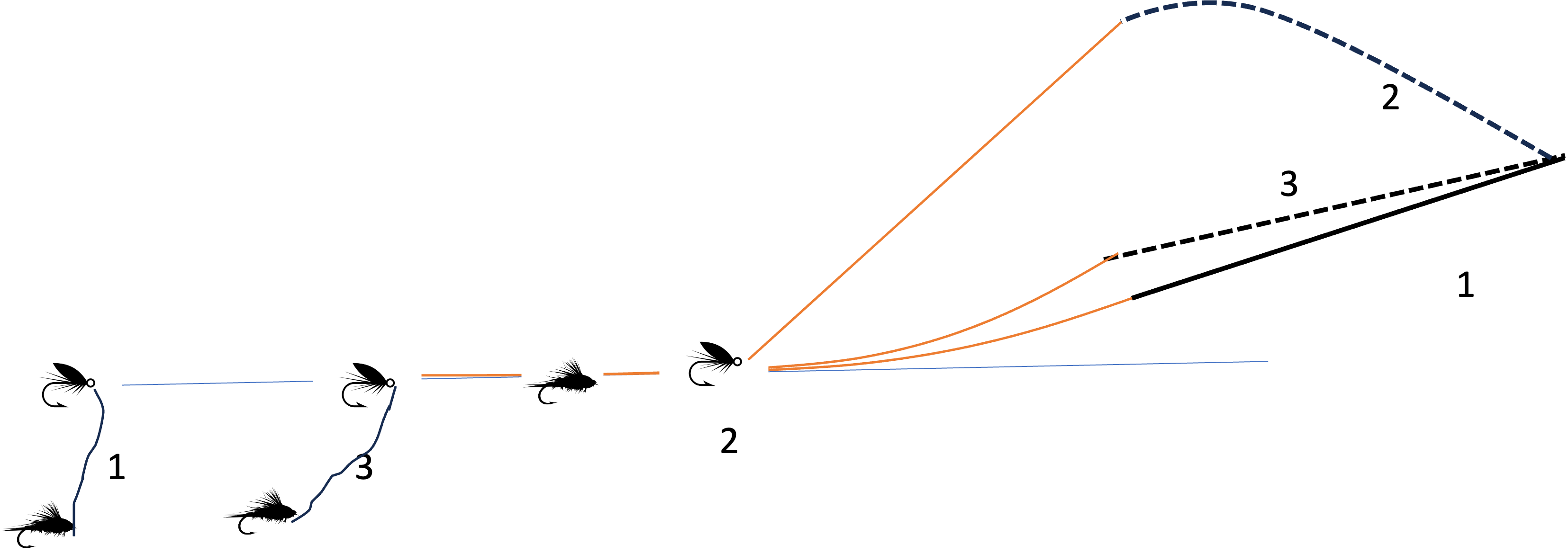 A good roll cast does the job. With a little practice (like 5 minutes on the stream) you’ll be able to just flick the dry upstream. The sunken flies act like anchors. When you’re casting down or across start off by making your wet flies land downstream of the dry. If this is difficult, don’t worry. Use your rod tip to lift the line and leader up and let the wets trail down below the dry. Now drop the rod tip down, shake out a little slack and you’re off to the races.