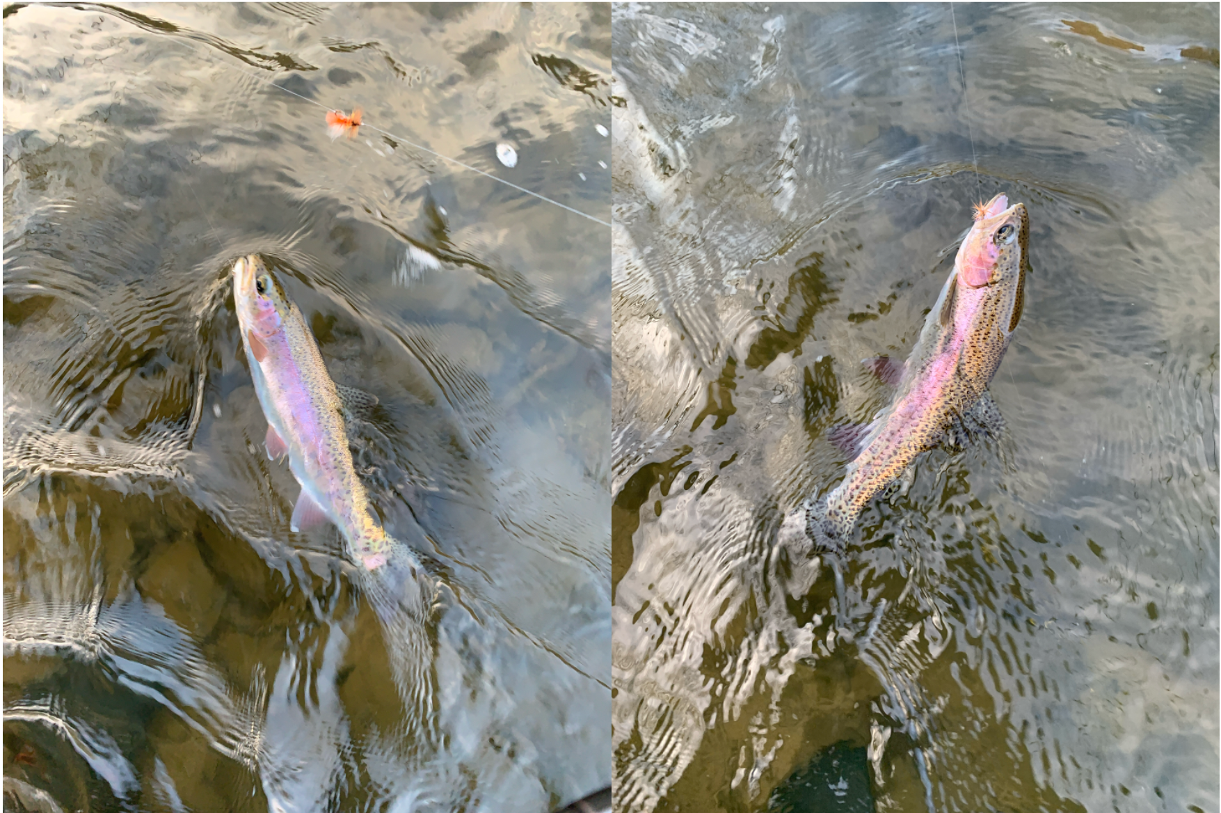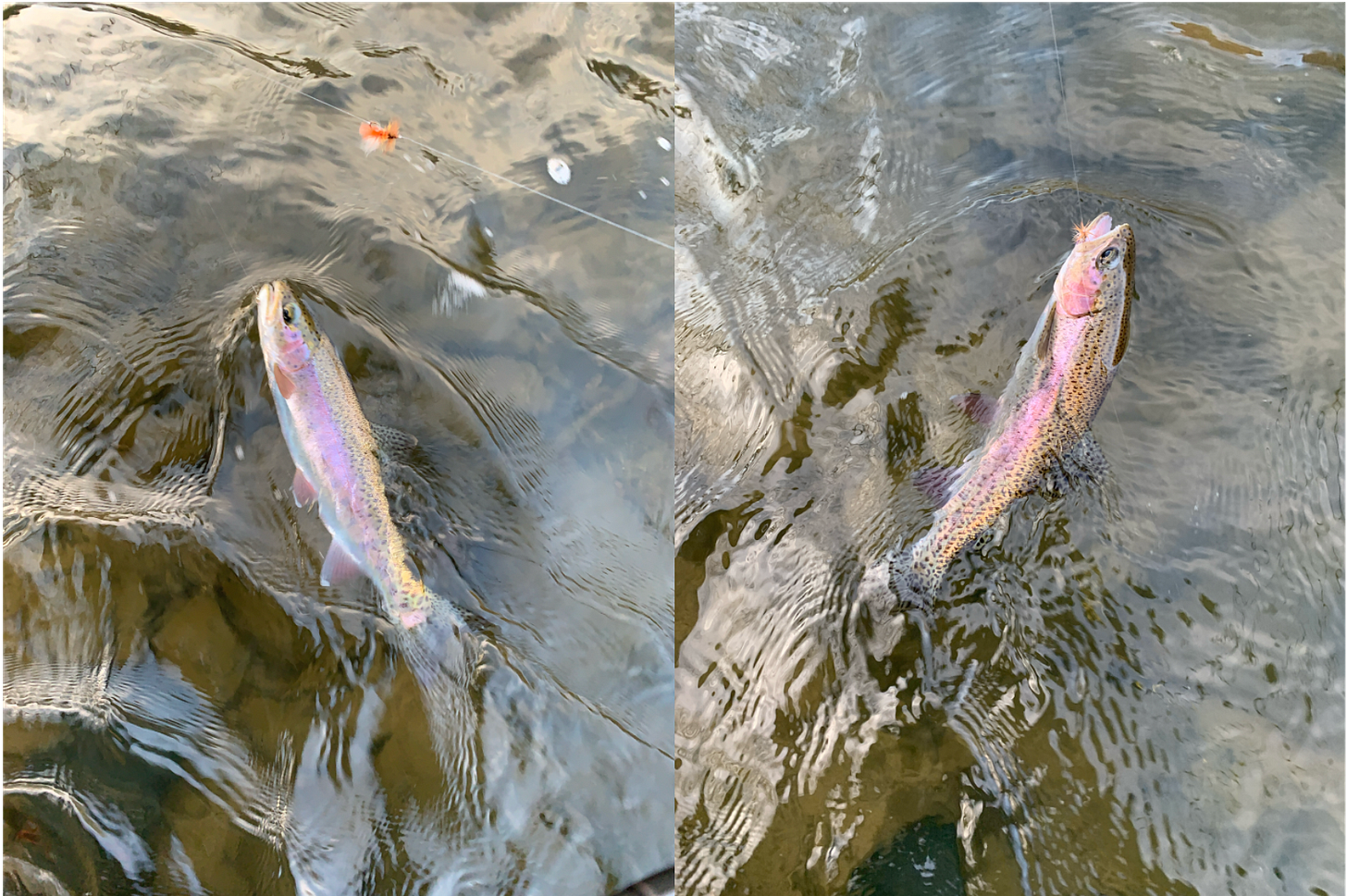 A tale of two rainbows caught on the same rig. The one on the left ate a nymph on a dropper and the one on the right ate the dry on the same rig. This is why the dry dropper rig is my absolute favorite way to fish nymphs. I tend to fish the dry dropper rig more often than any other kind of nymph set up. It doesn’t matter whether I’m fishing a little stream of the mighty Colorado.