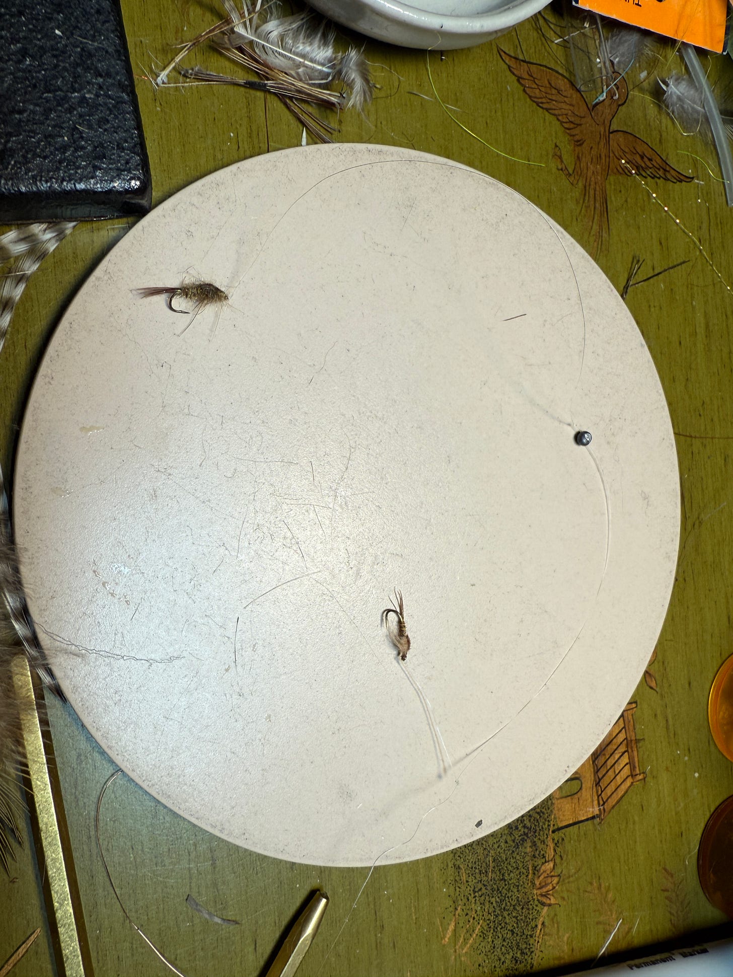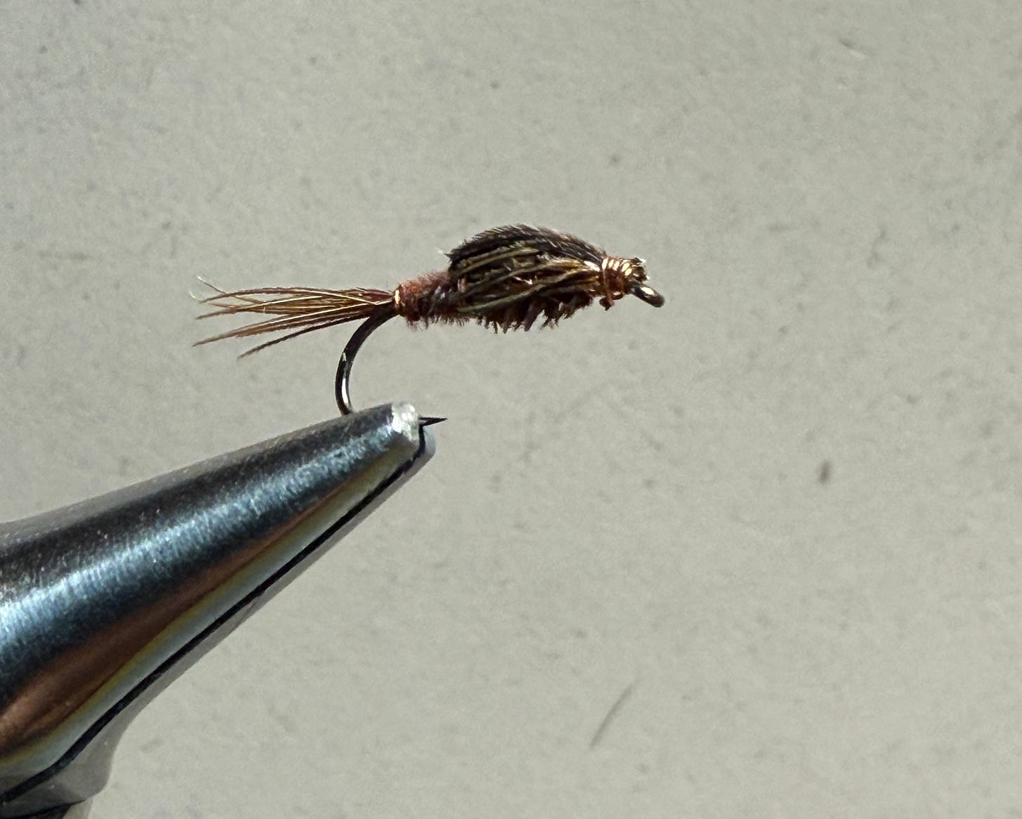 The fly is constructed entirely of two materials - the pheasant tail fibers and copper wire. No thread is used and the thorax is a ball of copper wire. Sawyer invented his fly on the same Avon on which I saw the guy fishing the maggots, albeit many miles upstream. But his water still had those deeper channelized sections so characteristic of English chalk streams. This fly, fished on a light tippet gets down reasonably well. But of course a weighted fly is the concept of moving the split shot close to the fly carried to its limit. People fishing 2 or 3 weighted flies on their leader are now mimicking the “maggot rig” without knowing it. I’m also convinced this is what leads to the success of Czech or Euro nymphing rigs. It’s starts with the fact that the weight is closer to the fly. And of course they stop letting the fly get downstream of the leader by the way they fish it.