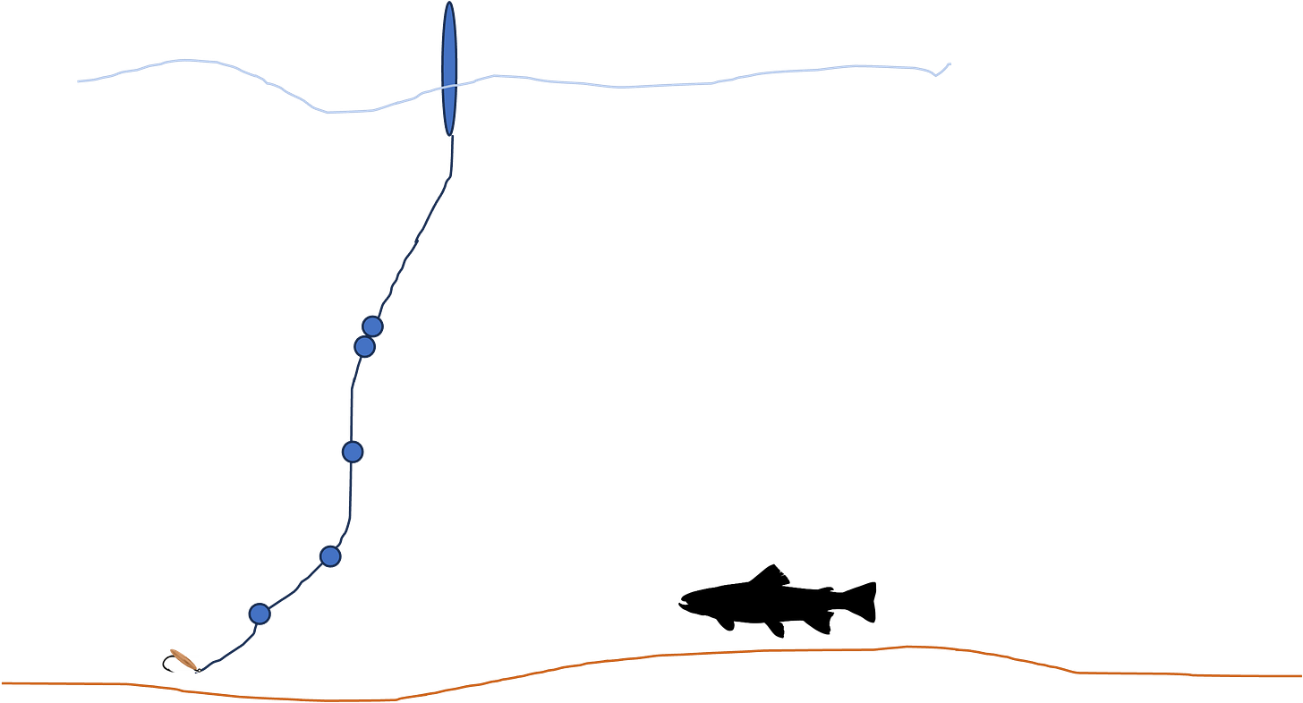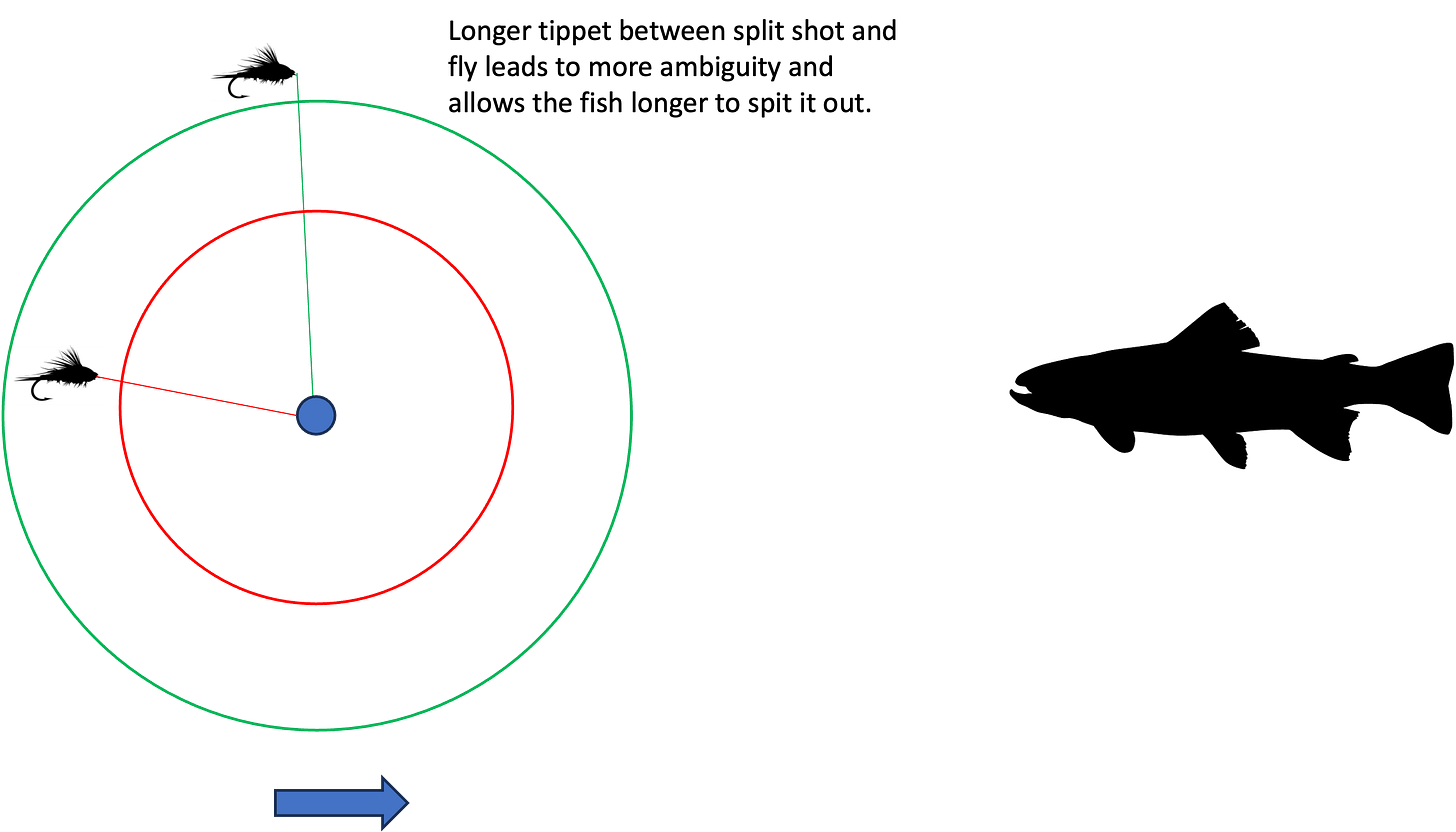 This is probably the most basic way to fish a nymph. When I first started fishing this way we didn’t use strike indicators and the like. We detected strikes by watching the fish, the leader or, in bigger water, the tip of our fly line. It quickly became evident that there were two things that absolutely wrecked one’s hookup percentage. The first was the inability to know exactly where your fly was at any time. The second was a setup where the fish could take your fly and spit it out without impeding the drift of your leader. In both instances the key is actually the point that anchors your leader to the river bed or water column. If you’re using a split shot, the anchor is your split shot. The longer the distance between the fly and the split shot the more ambiguity there is about the position of the fly. Also, when a fish grabs the fly it needs to stop not just the fly but also the anchor. Again, the longer the length of tippet between the fly and the split shot the more the chances the fish can spit the fly out before it affects the drift.