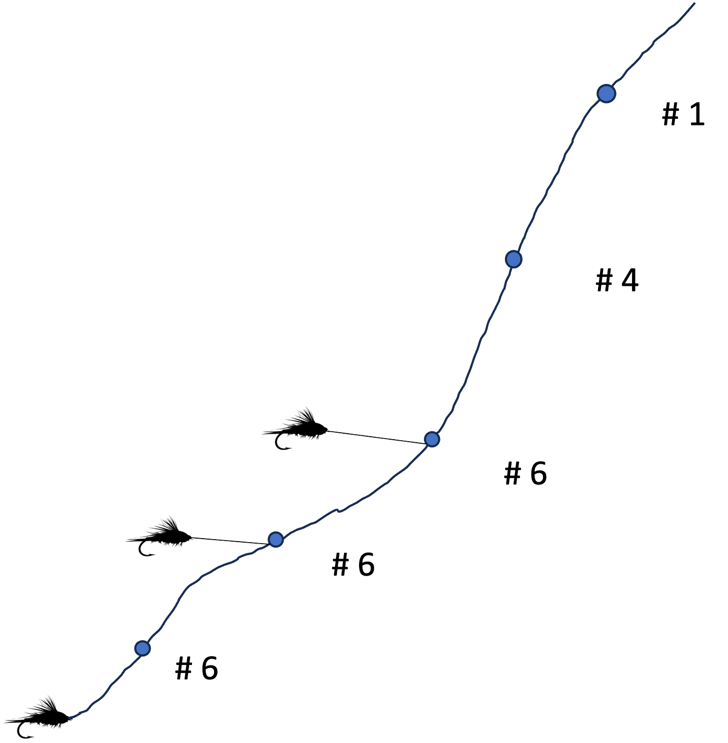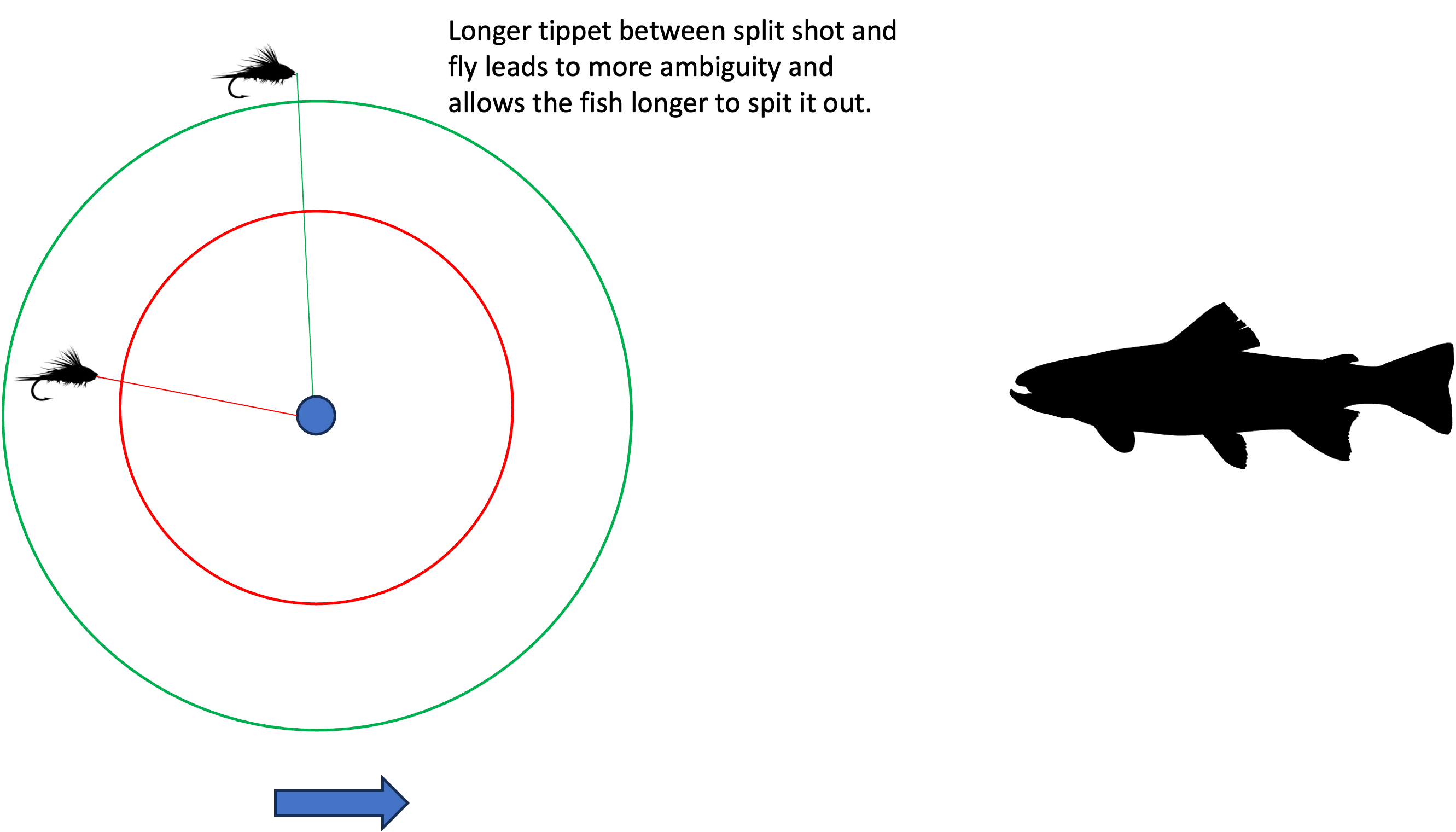 The same concept as above applies to a rig where you have multiple flies and are using split shot. Again, if you place your split shot above all your flies your tippet is relatively longer, leading to all the same issues as above. I like to put my split shot between the bottom two flies, as below.