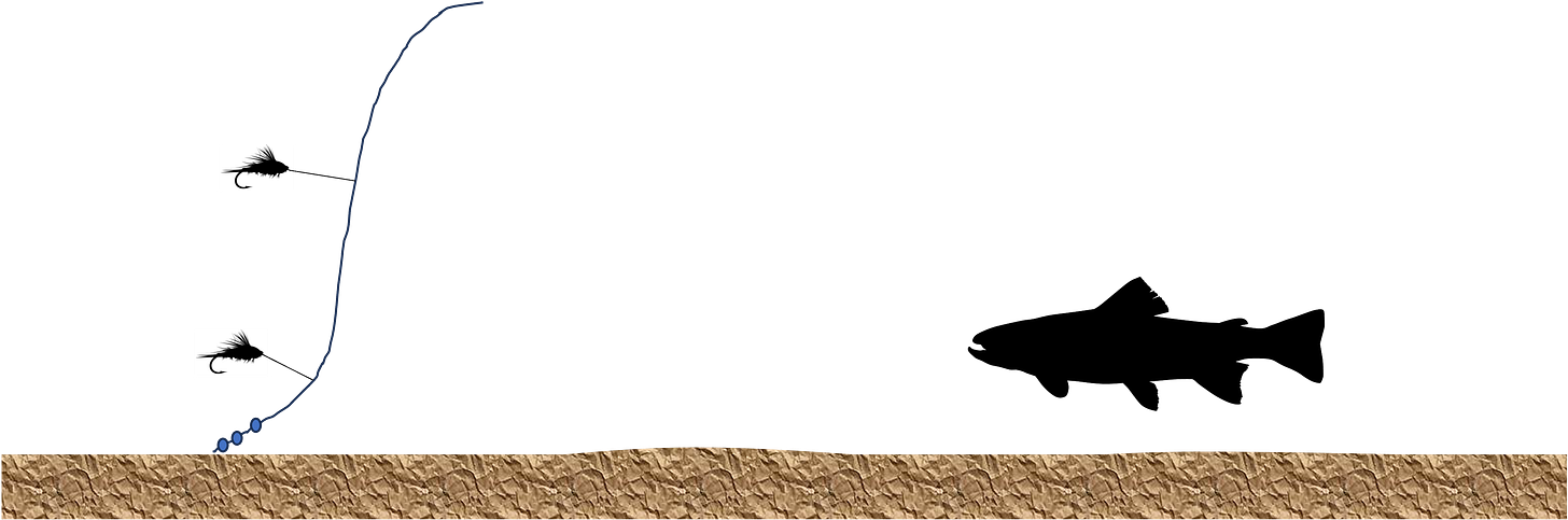 Sometimes a bottom bouncing (or Utah) rig might be just the ticket. But again this rig is effective because of the short distance between the flies and the split shot. Again, try keep the split shot upstream or parallel to the flies. It will vastly improve your hook up rate.