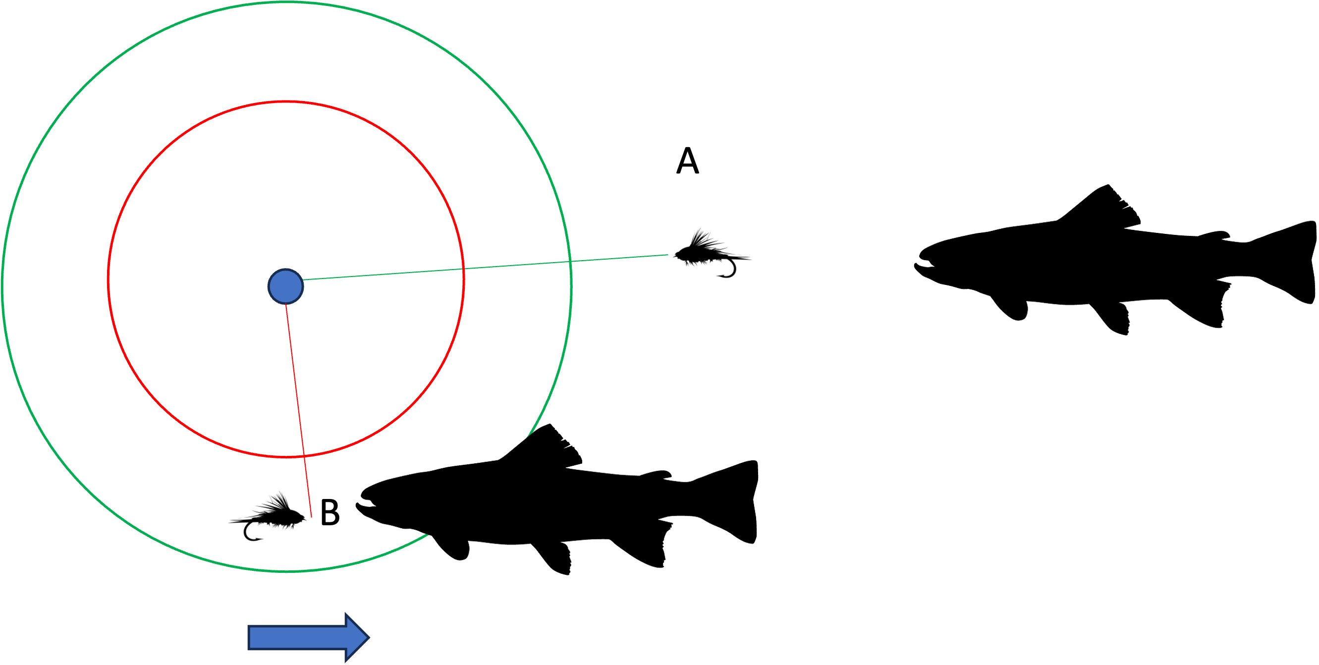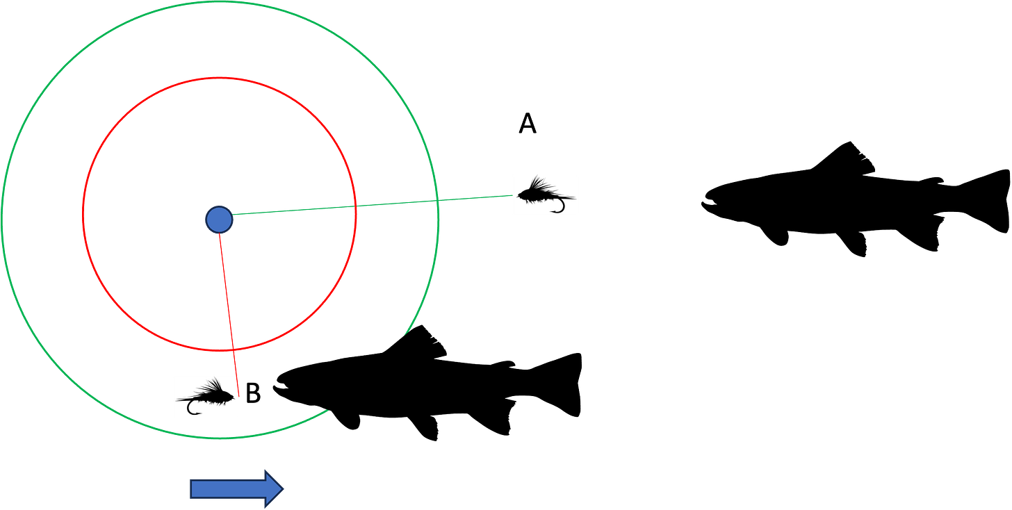 The other issue that arises is one of the position of the fly with respect to the split shot and the fish. In the picture below a fish taking the fly at A would have all sorts of time to spit it out before it ever moved or affected the anchor. The fish at B would have much less time.