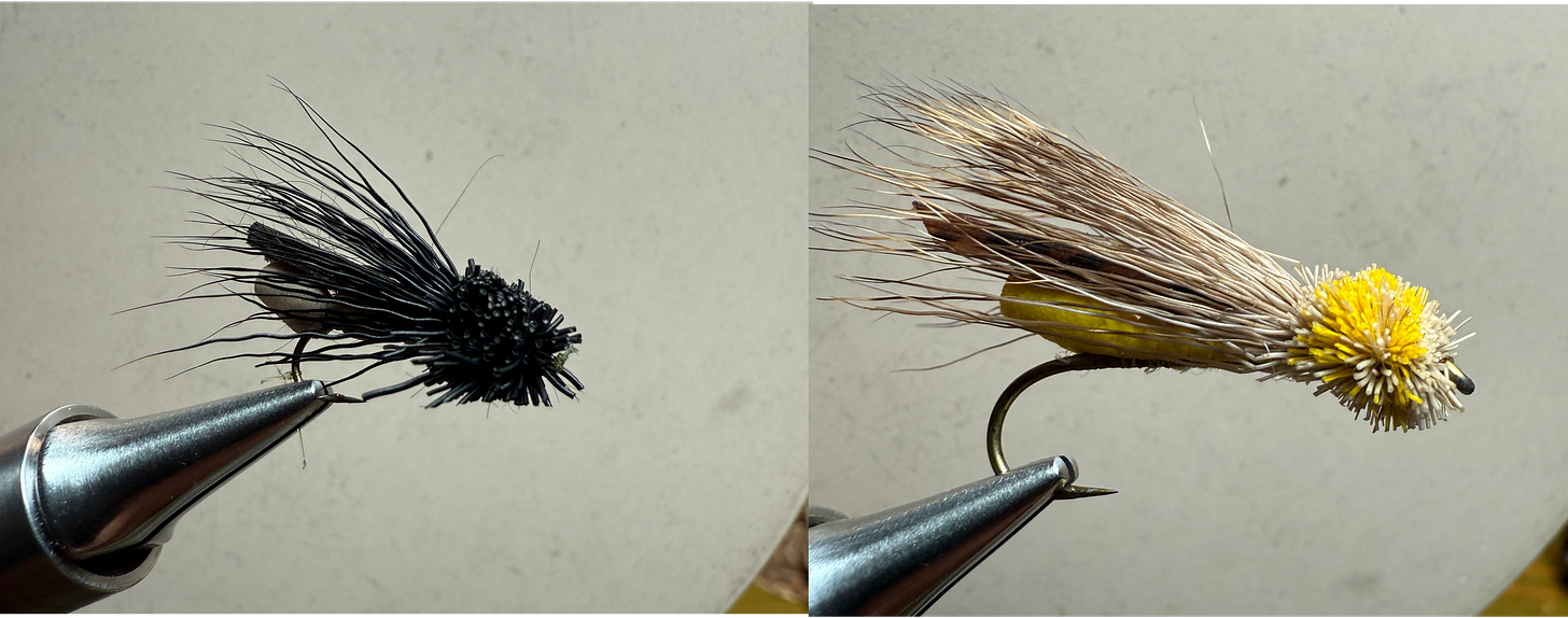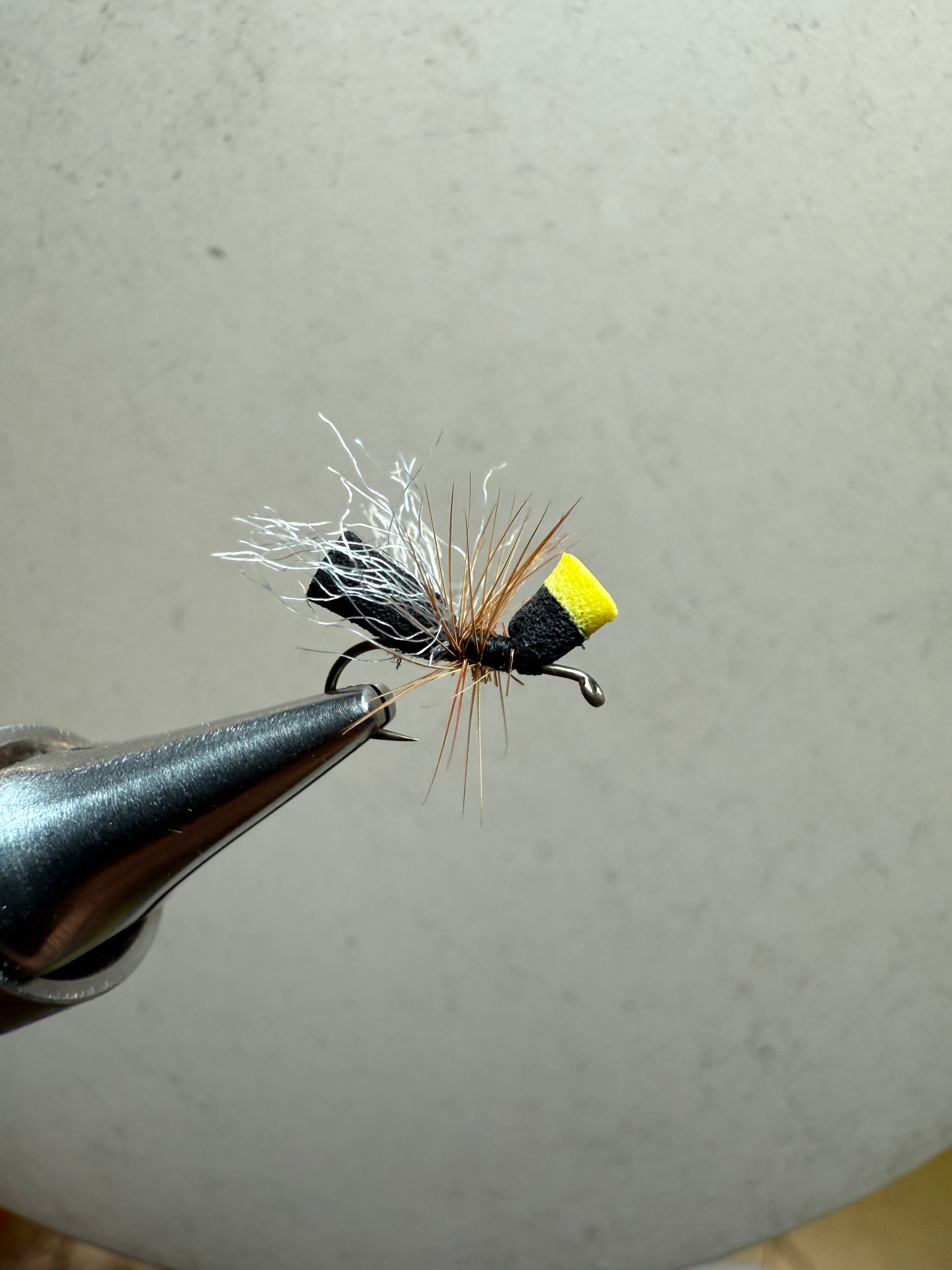 My companion to an ant is a beetle. I rarely fish one without the other. The beetle is a slightly more robust and rotund chap, mostly hitting the water with a plop. A bulky body helps. I use either deer hair or foam folded over the underbody . I find the deer hair gives a most satisfactory ploy when dropped on the water with a firm hand. And I like an underbody created by twirling together and wrapping multiple strands of peacock herl. The compact and dense structure comes down with a resounding plop. If you fish both an ant and a beetle you’ll find the beetle normally gets taken within the first 12-18 inches of where the fly lands. The ant, could be a while down the drift.