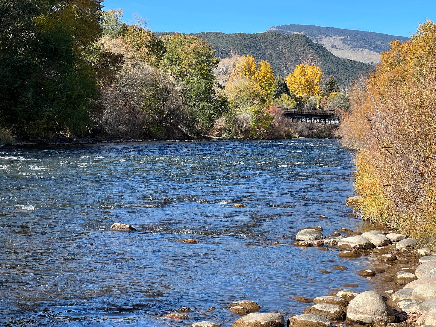 But way down in the lower reaches it’s now the time of the cricket. Even with a smattering of snow they’ll still crawl out and chirp their hearts out in the evenings. The river banks will now see elk and bear come down from up high, and as the days grow shorter we’ll find the trout eager to grab an errant cricket along the shore.