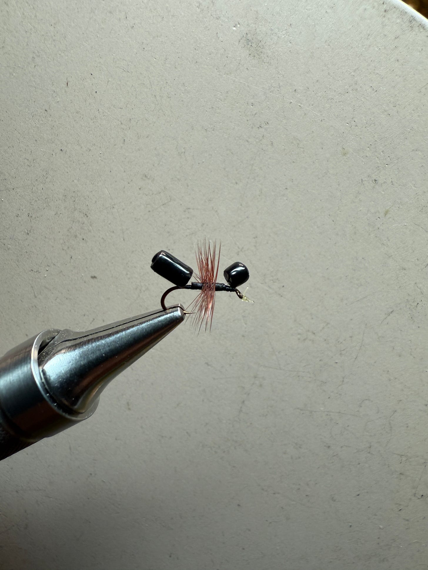 They also tend to wiggle about on the surface. Movement is always an attention grabber in hazy conditions such as a trout’s vision. The traditional fur ant works well, but even in my youth it required too much attention to keep floating right. 40 some years ago I came across a pattern called the McMurray ant and fished it for a long time. I still have some bodies left over and tie the occasional one up. The McMurray ant used two little cylinders of balsa strung onto a bit of monofilament and dipped in lacquer. Makes a pretty fly.