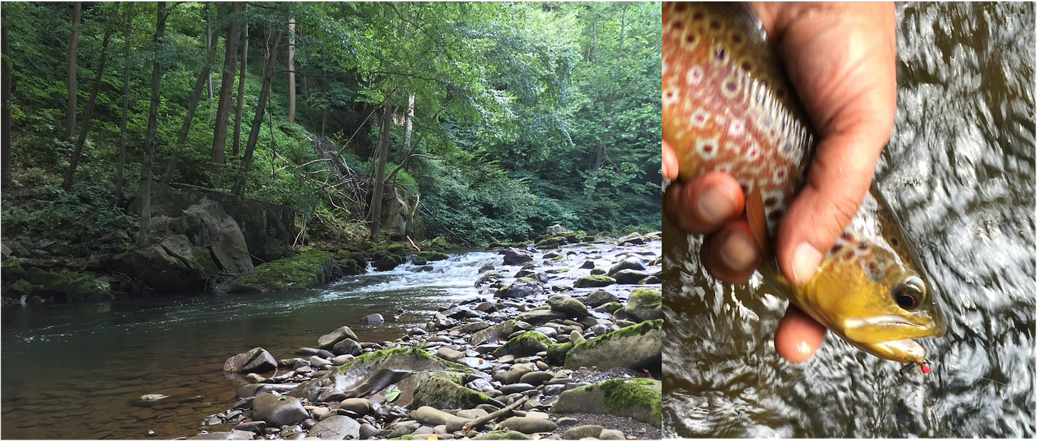 That is the beauty of fishing terrestrials. They do get deposited in trout waters, sometimes in copious numbers, but often regularly enough to be recognized as food. Their presence on the water is mostly happenstance. And so you don’t need a hatch or perfect timing to have fun fishing them. And they’re available to trout in streams big and small. This little woodland limestoner near my other home is another great terrestrial stream, and it is full of delightful little trout, like this little ant eating brown, appropriate to the size of the stream.