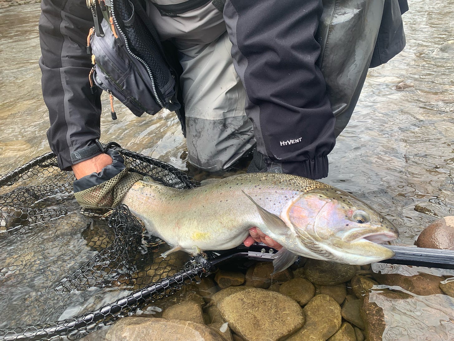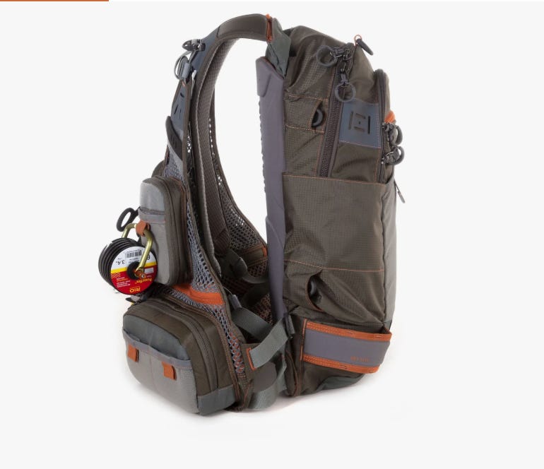 The thing was perfectly size to carry 4 to sex big Dewitt fly boxes in the big fron t pockets, a bunch of slim nymph boxes in the breast pocket, and a whole fly shops worth of other crap. It had big pouches in the back and could do everything but stand on its head and whistle Dixie out its butt. Fortunately mine’s still going strong, though I think after this year I’m going to have to find someone to copy one for me. A tailor in India or some such place would be able to do it. Because the geniuses around here have moved on to assorted contraptions such as this misbegotten son of a drunken night between a backpack and a fishing vest.