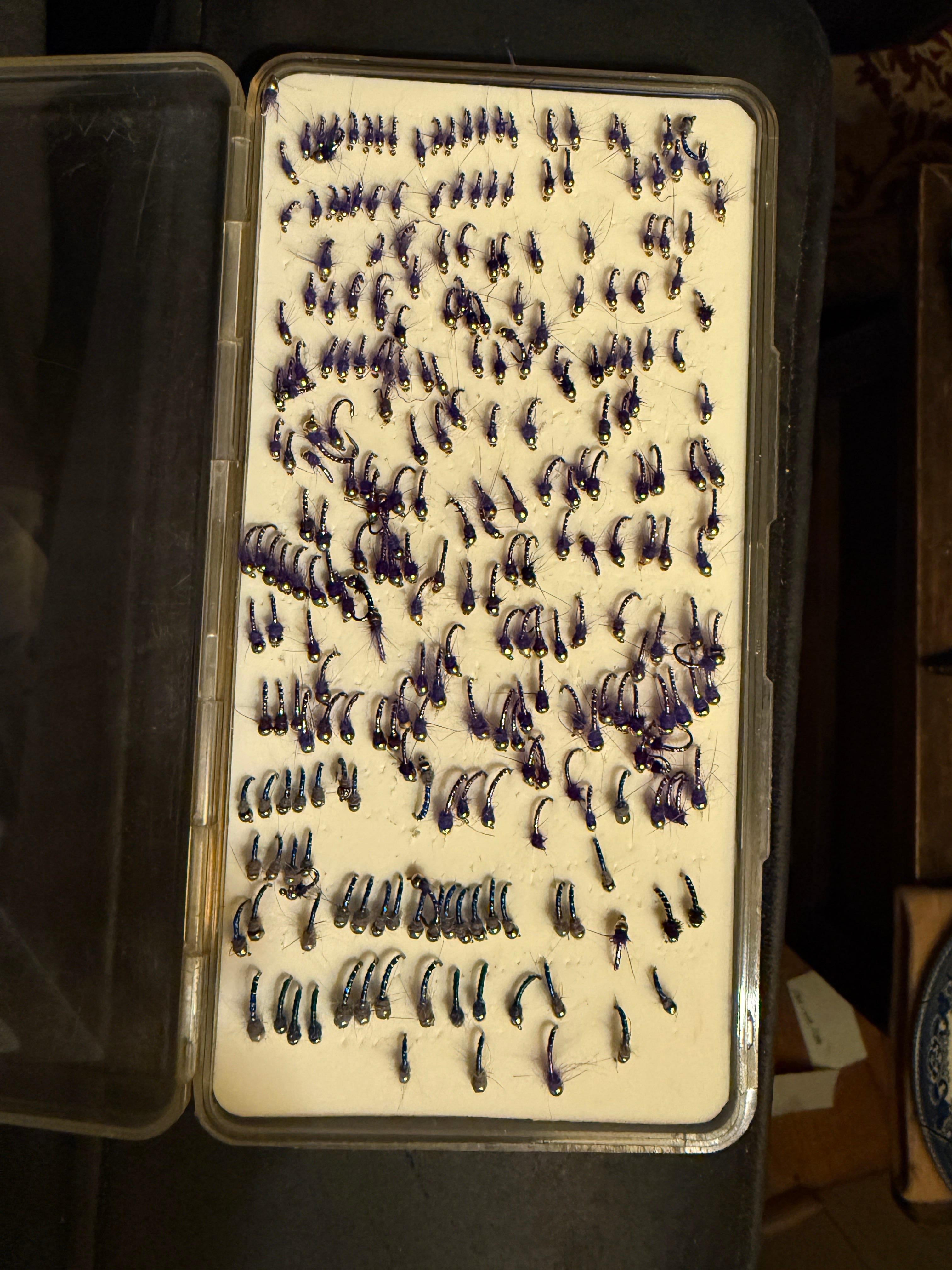 Here’s a severely depleted box of Purple and Blue Jerries (My fly names tend to a Grateful Dead bias, but that’s my weirdness) in its usual disarray. But I can pack about 350-400 flies into it (There are 40 in the first two rows). But then they decided that’s too many flies in one box, so they deiced to take some space away from us by cutting little triangles into the foam, and little slots to go with them. Now you can only use half the space. I guess there’s an argument to made saying you only lose half the flies when you lose a box. I’m sure you’re wondering about the mental acuity of this CosmicJohn dude. Doesn’t he know those slots are for holding flies. Like this: